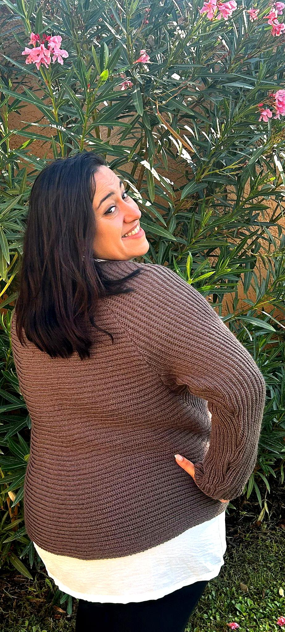 Grosse maille, idéal pour l'hiver, sa coupe est évasée sur les hanches pour harmoniser votre silhouette.