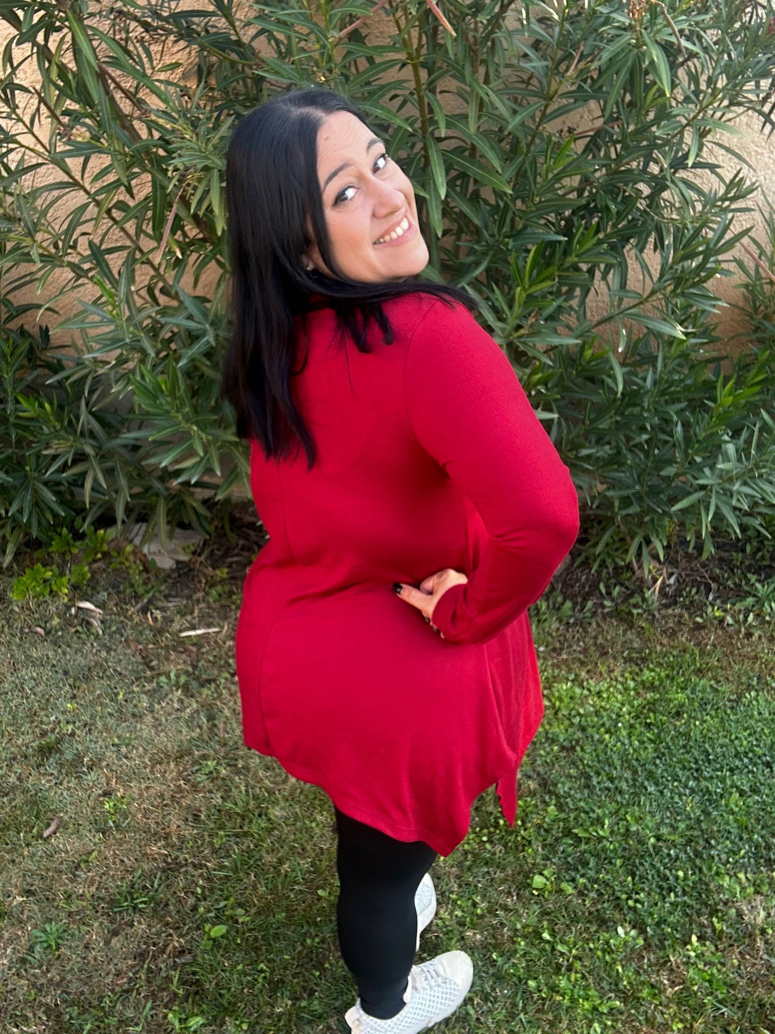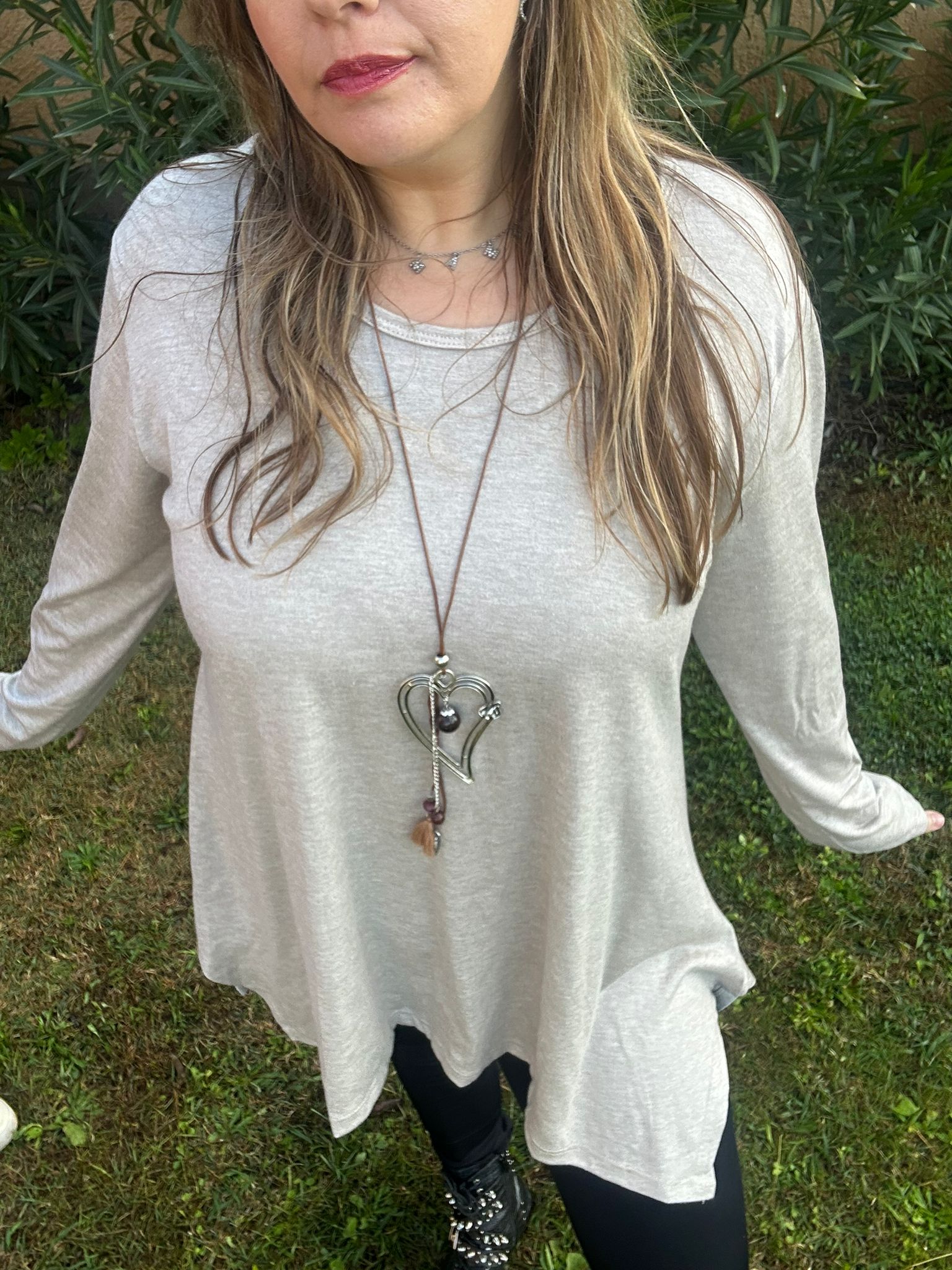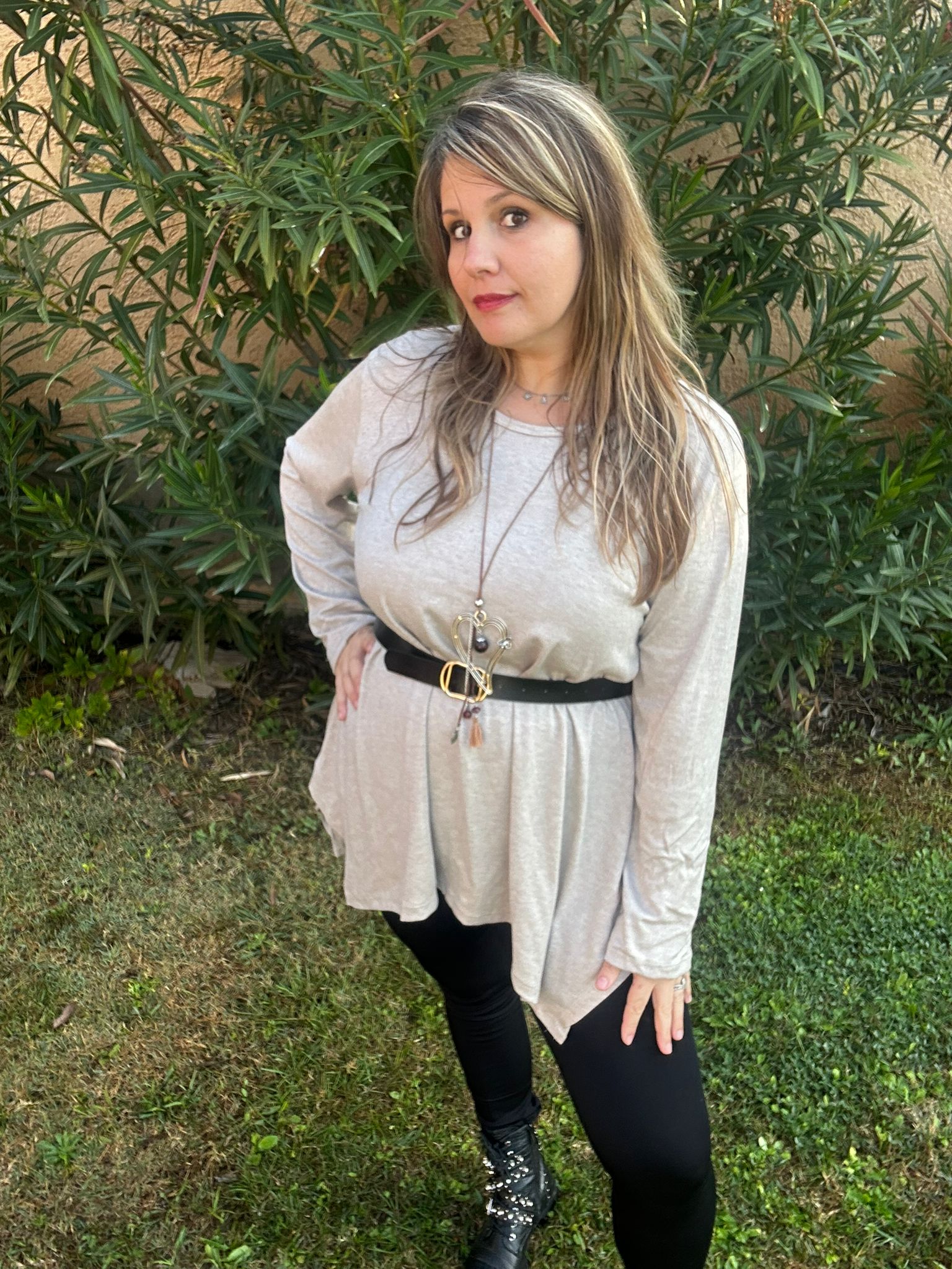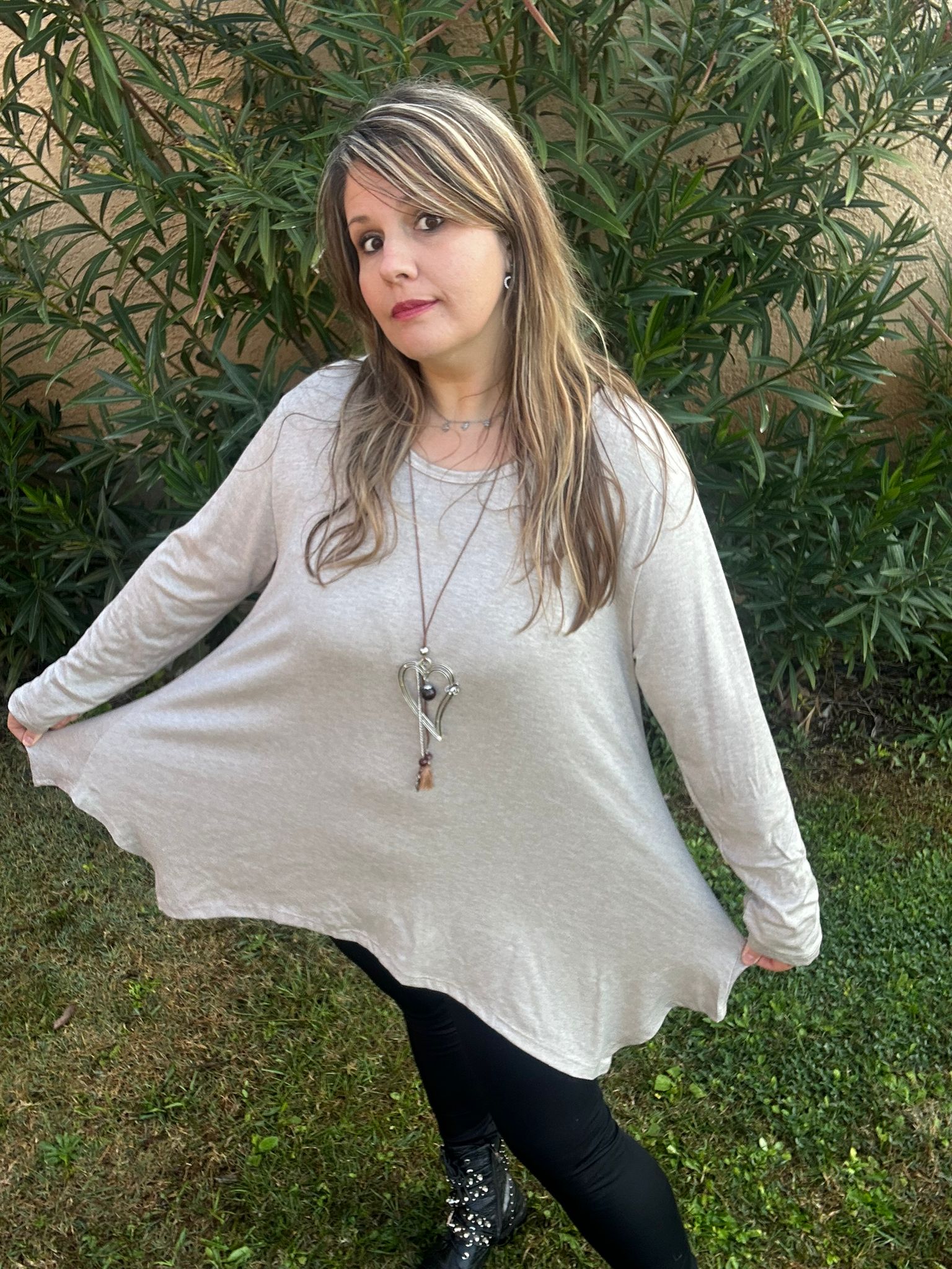 La tunique longue ampliforme "Lovely" séduit par sa coupe trapèze évasée qui dissimule avec finesse les formes, offrant une silhouette harmonieuse. Sa couleur neutre facilite son intégration à toutes les garde-robes.